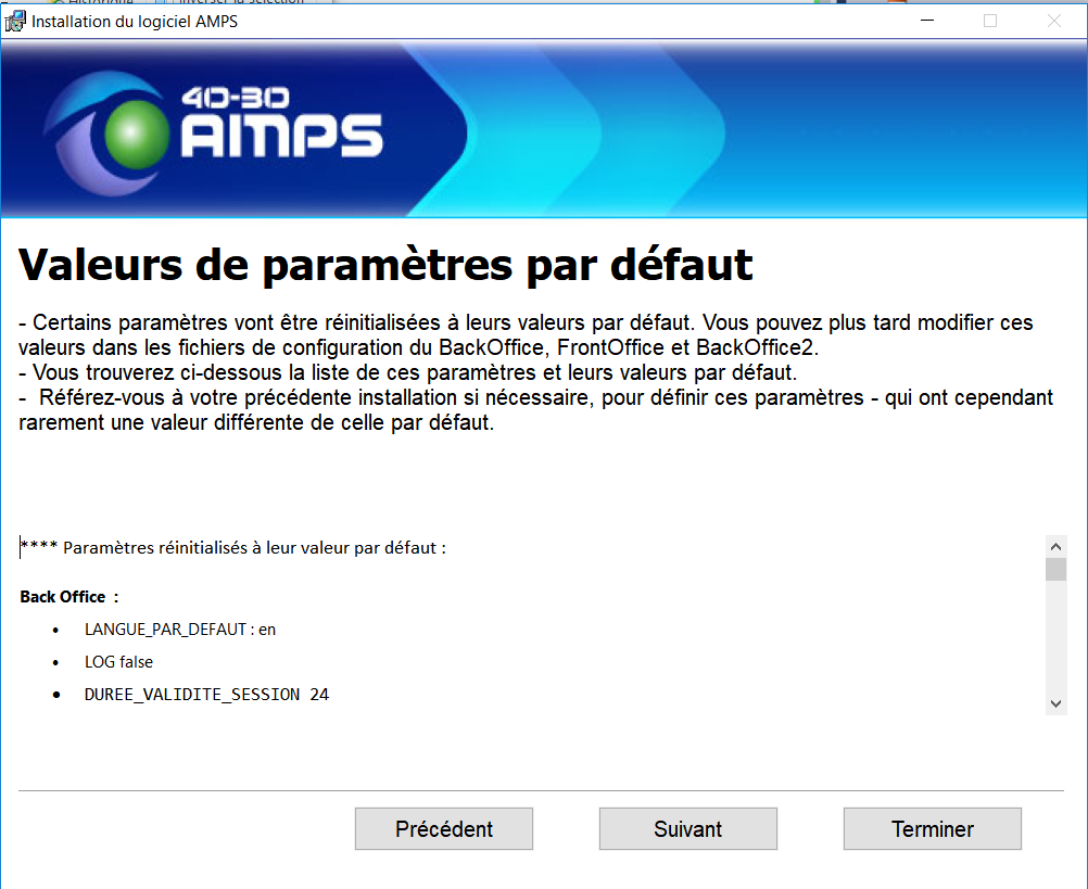 - Cet écran donne la liste des paramètres qui sont réinitialisés par l'installation, ainsi que leur valeur par défaut.