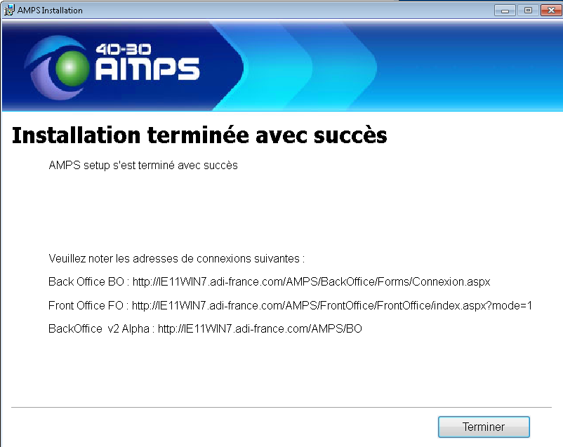 Cet écran fournit les adresses de connexions aux sites AMPS Front Office, Back Office, et Back Office 2