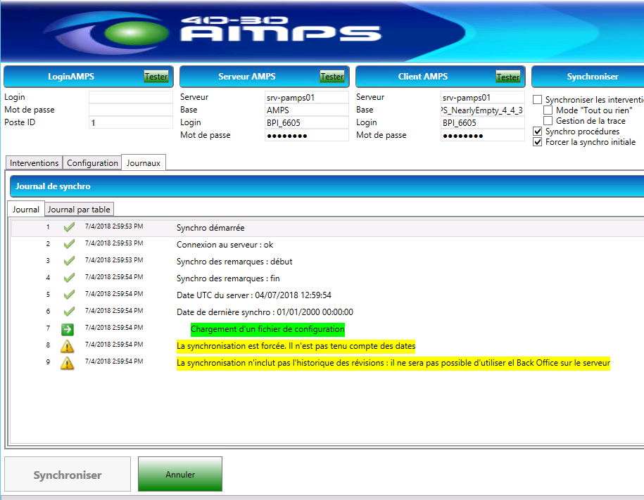 - La synchronisation peut synchroniser des données AMPS pour les procédures et/ou les interventions entre différents déploiements AMPS.